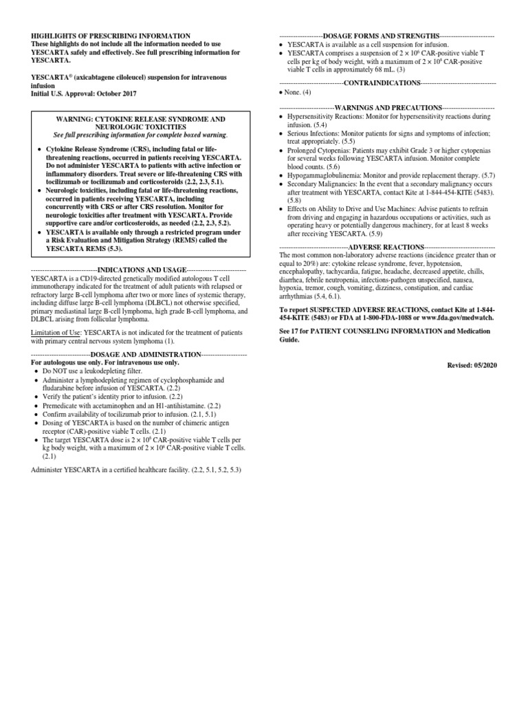 Package Insert YESCARTA PDF Lymphoma Hepatitis B Package Insert Yescarta Each single infusion bag of. yescarta® (axicabtagene ciloleucel) suspension for intravenous infusion package insert 1 indications and. yescarta est indiqué pour le traitement des patients adultes atteints de ldgcb et de lymphome médiastinal primitif à grandes. Package Insert Yescarta.